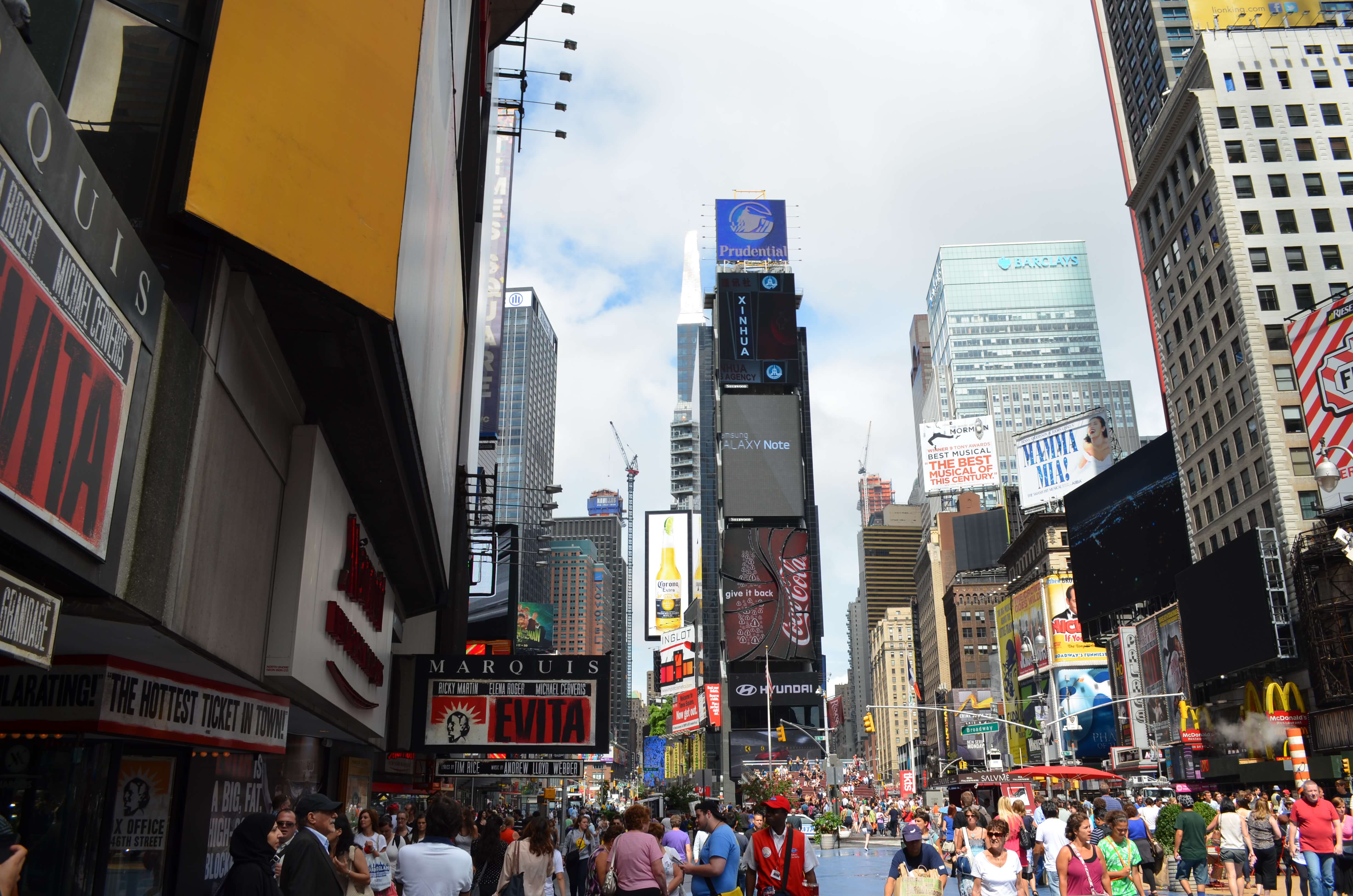 Pour la dernière nuit j’avais réservé un hôtel sur Times Square pour vraiment être au coeur de la ville, on a donc dormi au Marriott Marquis. Précisons qu’on fêtait l’anniversaire de Pauline, d’où la subite envie de se payer un hôtel 4* de ce standing ! Rien à redire sur l’hôtel, grand (ou plutôt immense), beau, accueil très sympa, belle chambre avec vue sur Times Square, le seul hic est le moment où on nous présente la facture, qu’on y voit les taxes et tout ce qui s’en suit .. Le luxe New Yorkais a un prix !